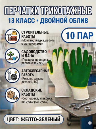 - Перчатки трикотажные с 2-ым латексным обливом зеленые 13 класс 1уп-10пар, 1ящ-300пар, Арт. ПВХ2-01Т