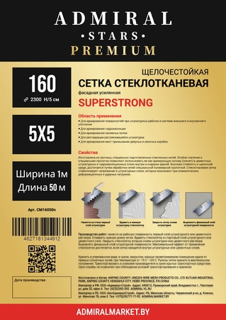 Сетка малярная 160 гр/м2 1м*10м фасадная усиленная 5х5 ADMIRAL (синяя) PREMIUM 1/20